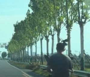 Un pequeño animal comenzó a molestar y a revolotear sobre la cabeza de un motociclista mientras trataba de circular por una carretera en China.