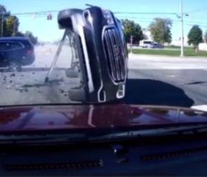 Dos coches chocan en Estados Unidos en una intersección, saliendo despedido uno de ellos hacia un paso de cebra por donde cruzaba un peatón, que pudo esquivar el golpe.