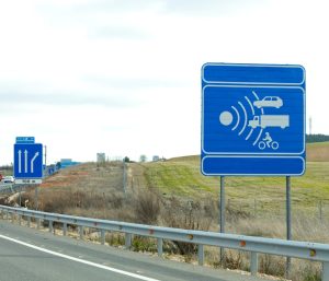 Es habitual encontrar paneles informativos, en el arcén o en los luminosos de los pórticos, informando de la presencia de un cinemómetro.