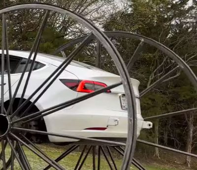 ¿Es posible conducir un Tesla del revés con unas ruedas gigantes? Un ‘youtuber’ hace la prueba con un Model 3 para comprobar su seguridad.