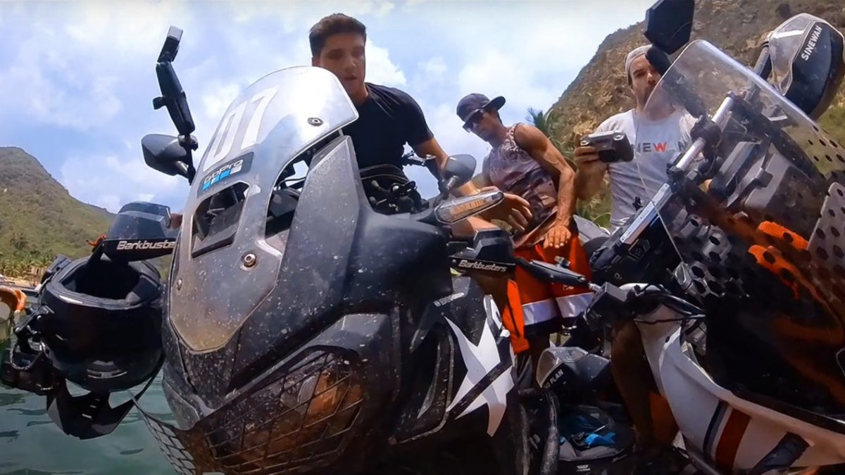 El motorista, junto con su amigo Sebastián, deciden abandonar la playa en la que se encuentran a bordo de una canoa en la que también viajarán sus motos.