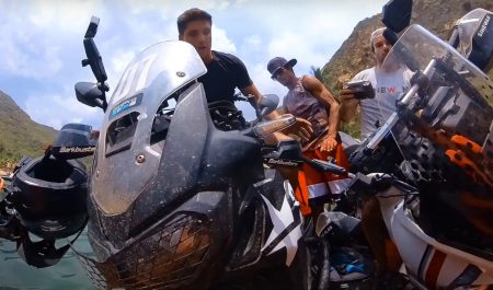 Charly Sinewan se lleva un pequeño susto al atar mal su moto en una canoa