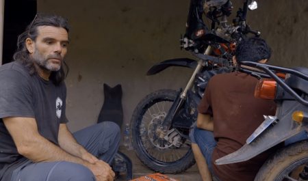 Tras hundir su moto en un río, el motorista español intenta arreglar las averías causadas con la ayuda de los habitantes de la zona.