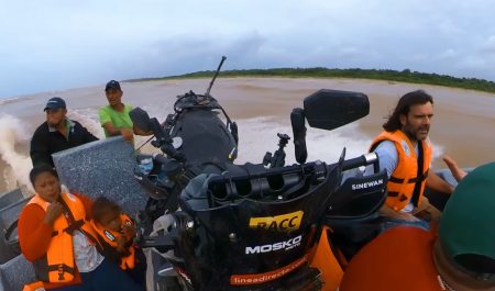 Charly Sinewan sube su moto a una barca sin muchas garantías
