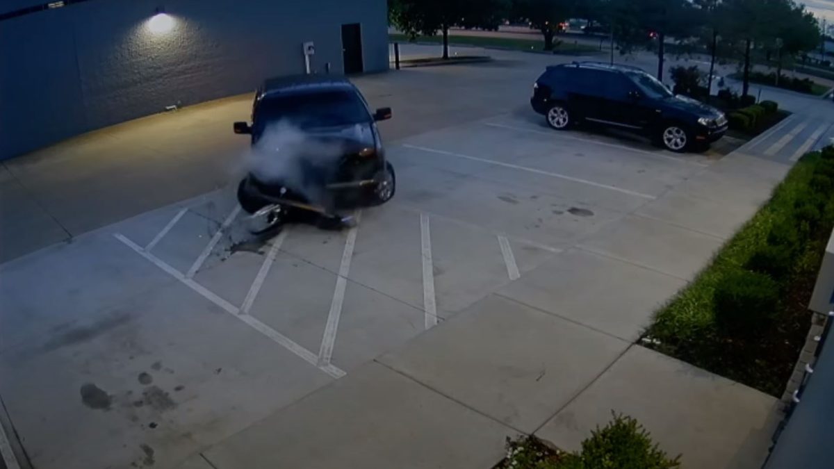 Las cámaras de seguridad de un taller mecánico de Oklahoma captaron el momento en el que un conductor ebrio choca contra un árbol, pero aparca a toda costa.
