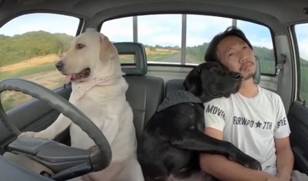 Las imágenes muestran a un hombre y su mascota a bordo de dos vehículos, con el animal a los mandos en los dos casos.