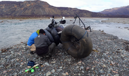 El motorista español se prepara para superar un peligroso río que tendrá que cruzar con su moto de 220 kilos, para lo cual ha ideado un ingenioso sistema.