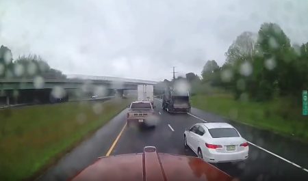 El automóvil no renuncia a su maniobra de cambio de carril y el camión tampoco lo facilita. ¿El resultado? Menos grave de lo previsible...