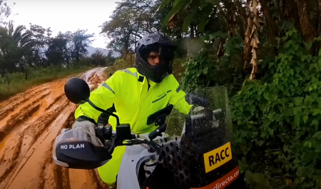 A pesar de que el barro y las condiciones desfavorables estén entorpeciendo la aventura en su nueva Ducati, el motorista no desiste.