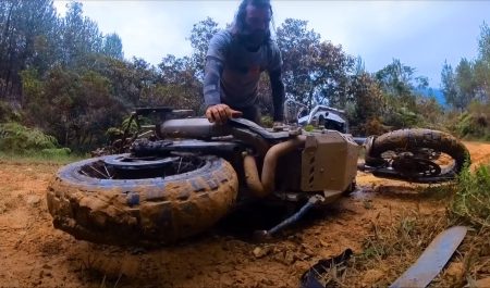 El temporal en Colombia está causando estragos en el viaje del motorista, especialmente el barro, que provoca que su moto se quede atascada.