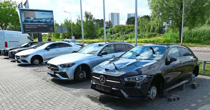 Hace unas semanas ocurrió un robo de lo más atípico a las puertas de un concesionario de Mercedes en Groningen, Holanda. Los ladrones, que accedieron a alrededor de 15 de estos coches completamente nuevos, optaron no por llevárselos, sino por dejarlos a todos sin las cuatro ruedas, incluyendo las llantas.