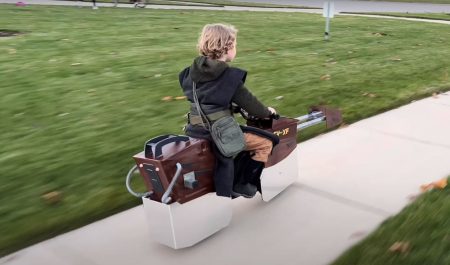 Con cartón, cinta adhesiva y pintura, un padre logró simular la moto deslizadora de la franquicia, con la que ambos asistieron a una Comic-Con.