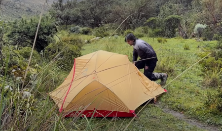 Después de llegar a la Laguna Parón en Perú, el motorista continúa su camino hasta acabar acampando en un lugar escondido a una altura de vértigo.
