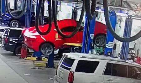 A un paso del desastre total: un Corvette se cae solo de la plataforma del taller