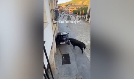 Un toro se ha convertido en el protagonista de las fiestas de Tendilla (Guadalajara) por embestir un vehículo de forma impactante. El Peugeot 208, que estaba estacionado en la calle, quedó destrozado tras los múltiples y brutales golpes del animal. Las imágenes fueron captadas por una mujer desde el balcón de su casa y rápidamente se hicieron virales en redes sociales.