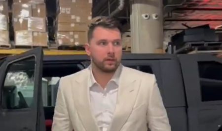Con un traje blanco y un ‘tanque’ de seis ruedas: así llegó Luka Doncic al partido contra los Boston Celtics