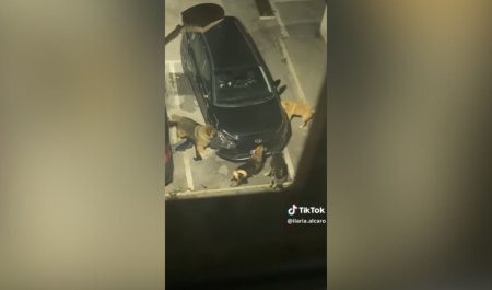 Los animales se acercaron por la noche a un vehículo que estaba aparcado en una calle de la ciudad de Nápoles y comenzaron a arrancar el parachoques.