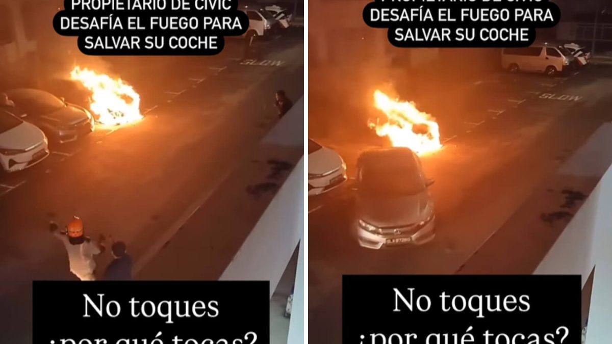 Puede que eso fue lo que impulsó al propietario de este Honda Civic. Su coche estaba aparcado al lado de un vehículo que estaba en llamas y no se paró a pensar: se subió a su coche, arrancó y lo sacó de ahí… mientras los bomberos le pedían, en inglés, que se alejase y los agentes de policía le recriminaban su acción golpeando la carrocería.
