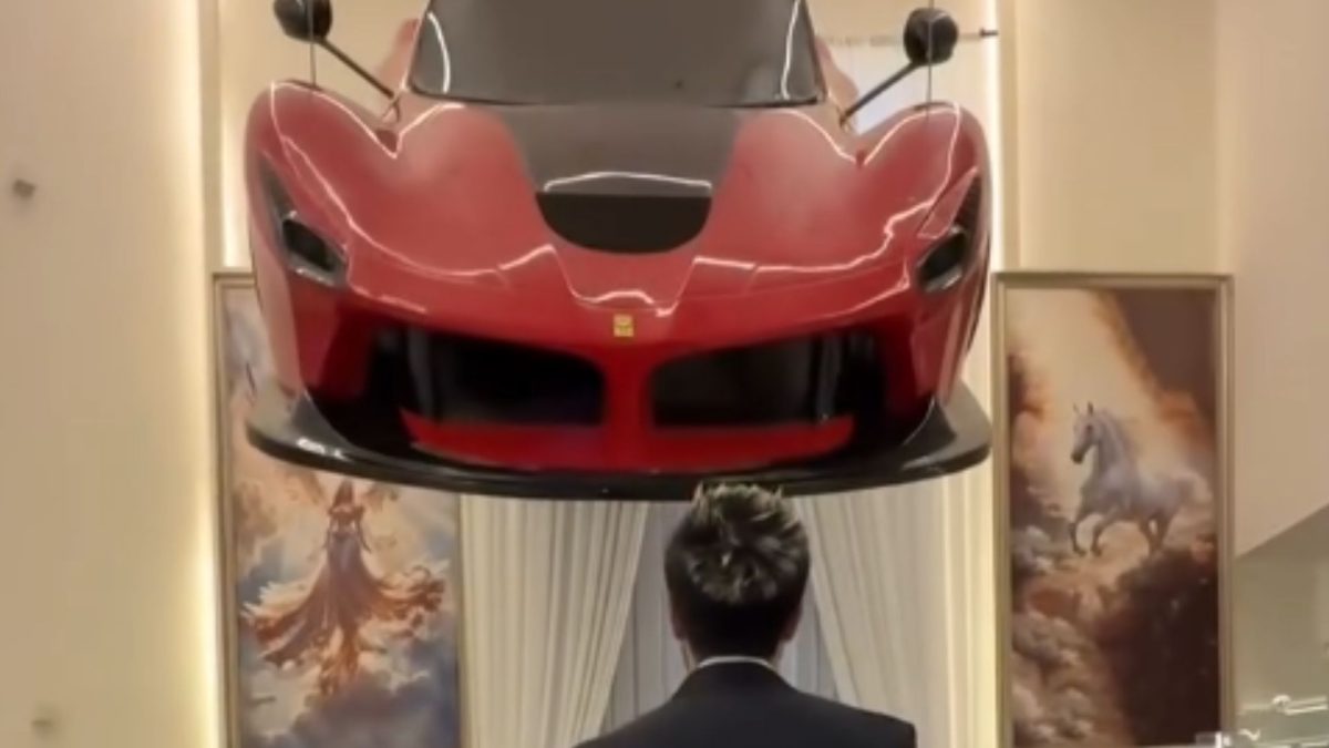 El que puede, puede: colgó un Ferrari de miles de euros en el techo de su salón para usarlo como lámpara