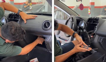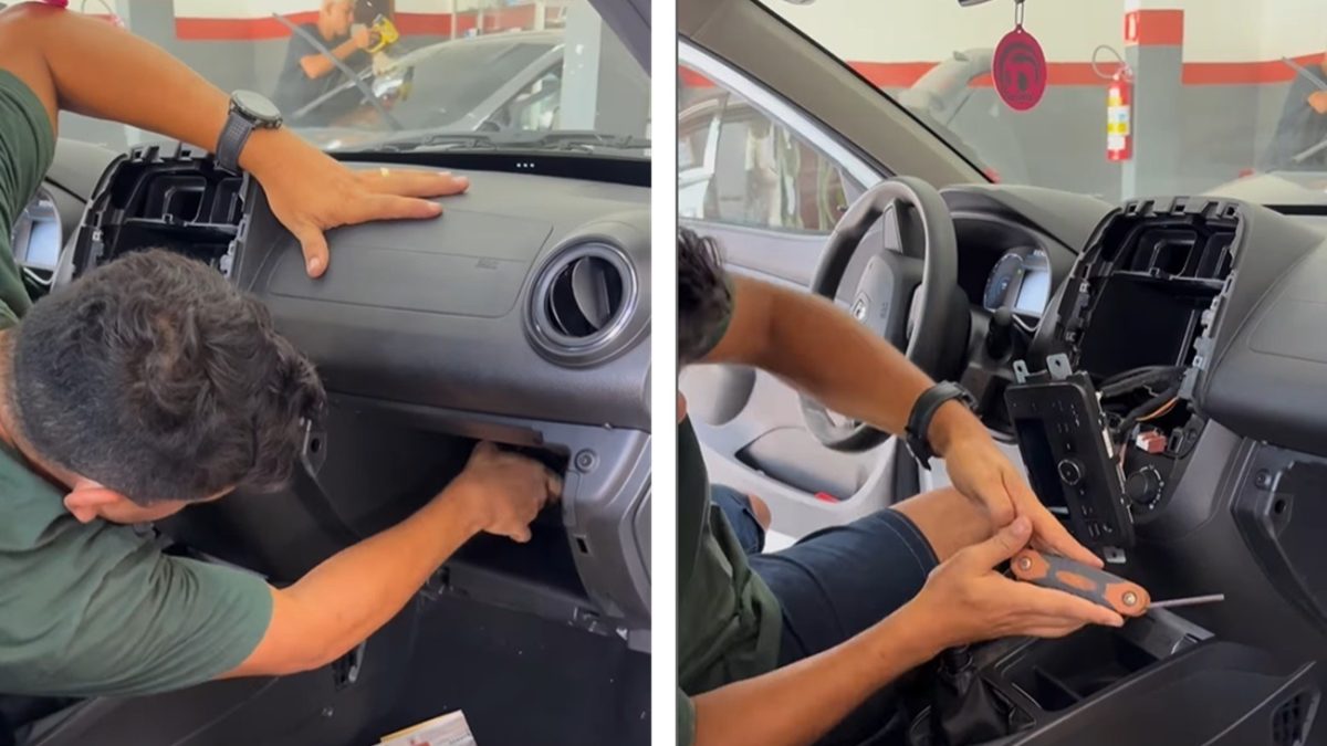 El siguiente vídeo ilustra la sorpresa con la que se encontró un mecánico en Brasil. Escuchó un sonido extraño dentro del coche, por lo que sacó la radio del vehículo para averiguar el origen. Y no fue suficiente: terminó desmontando gran parte del panel y hasta la guantera, y finalmente la gran duda fue develada.