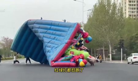 El fuerte viento en la ciudad china de Zhengzhou provocó que un castillo hinchable de grandes dimensiones apareciese en mitad de la carretera.