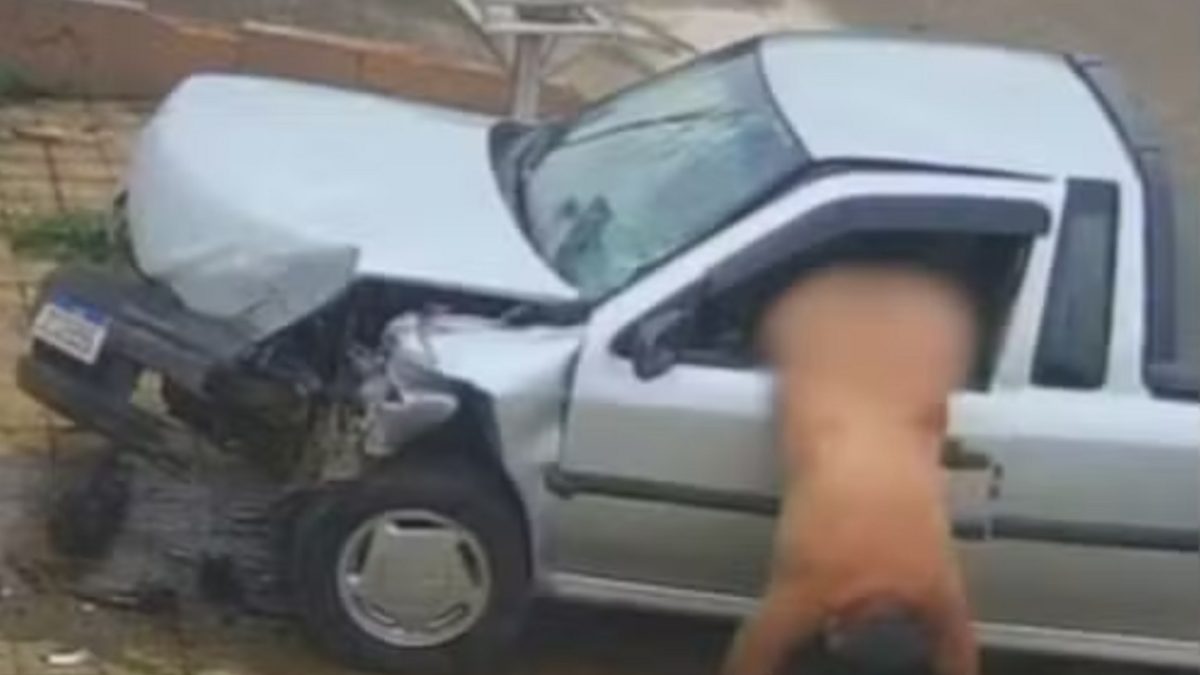 Tras el choque, en las imágenes se ve al hombre rompiendo los cristales para salir del vehículo. Luego camina por la calle, se acerca a otro coche por unos momentos y después sale corriendo: todo esto, sin ropa.