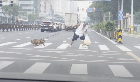 Este perro se ha ganado el premio al más perezoso: se queda parado en mitad de un paso de peatones y su dueño tiene que hacer esto