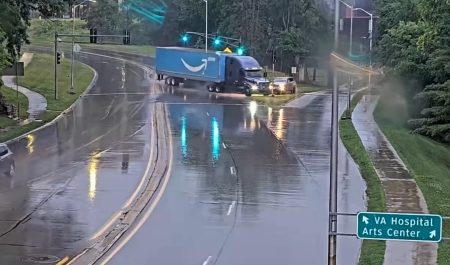 Un trabajador de Amazon ha vivio en una carretera de Iowa (Estados Unidos) una situación peliaguda. Mientras iba circulando, su camión comenzó a deslizarse por el agua que había en el asfalto. A pesar de sus esfuerzos por tratar de controlarlo, el conductor se salió de la vía hasta acabar entre árboles.