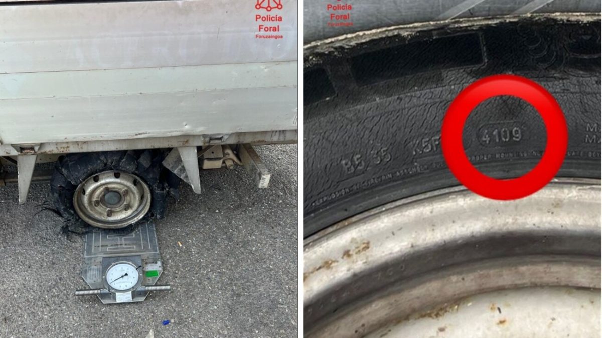 Un camión circulaba con un exceso de 1.000 kilos de carga (que además estaba descubierta) y esto tuvo como consecuencia una rueda reventada. Y no es de extrañar, si según los datos impresos en el propio neumático, este data del año 2009.