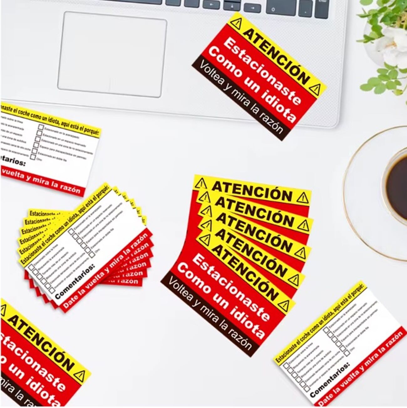 Están impresas en papel resistente, con mensajes llamativos en colores rojo y amarillo, y permiten marcar el motivo del mal aparcamiento, como ocupar dos plazas o bloquear una salida.