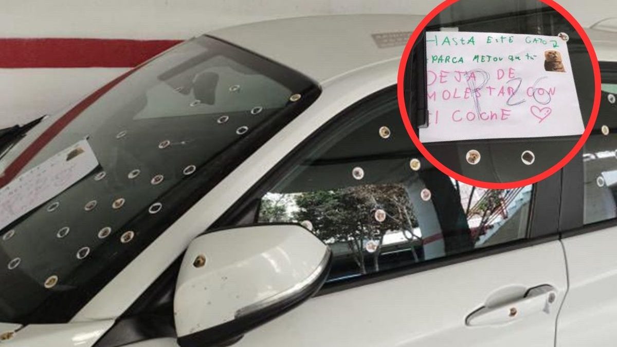 Y es que el coche ha sido plagado de pegatinas (en las imágenes se detectan decenas de ellas adheridas a la carrocería: capó, ventana, tirador de la puerta, etc.). Y no sólo eso: También dejaron un cartel pegado, evidentemente escrito por un menor, con el mensaje: “Hasta el gato aparca mejor que tú”.