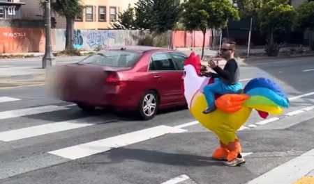 Como se ve en el vídeo, no todos los conductores paran. Ante esta actitud, el teniente Jonathan Ozol ha confesado al medio SFGate que si no ven a alguien vestido con un disfraz hinchable de un pollo enorme, “tienen un problema”.