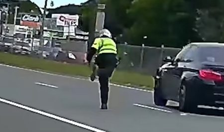 Un policía de Queensland fue captado lanzando su dispositivo a un vehículo que no se detuvo en una zona escolar de Sunshine Coast (Australia).