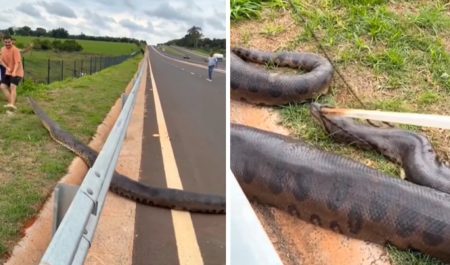 Se cruza una anaconda de más de cinco metros en una carretera de Brasil, pero nadie da crédito a lo que hacen los conductores con el animal