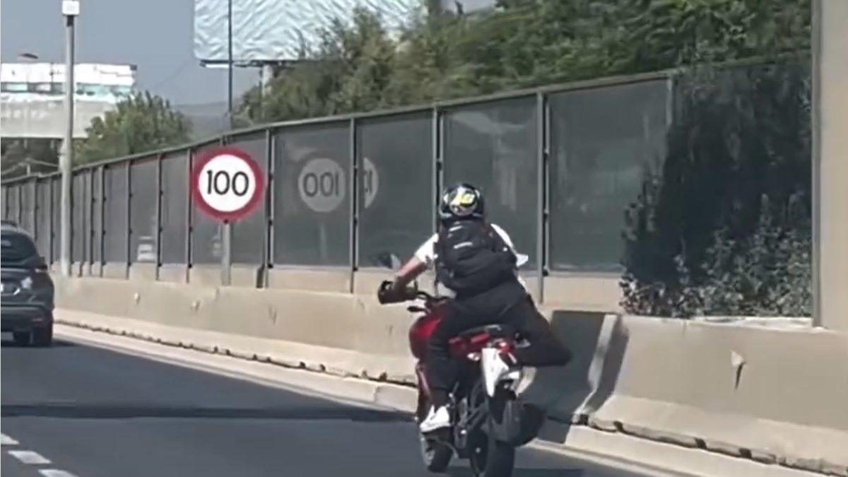 Un increíble movimiento logró hacer este hombre sobre su motocicleta mientras conducía, digno de un espectáculo de circense. Pero no fue en un circo, sino en plena autopista en Santiago de Chile (Vespucio Norte).